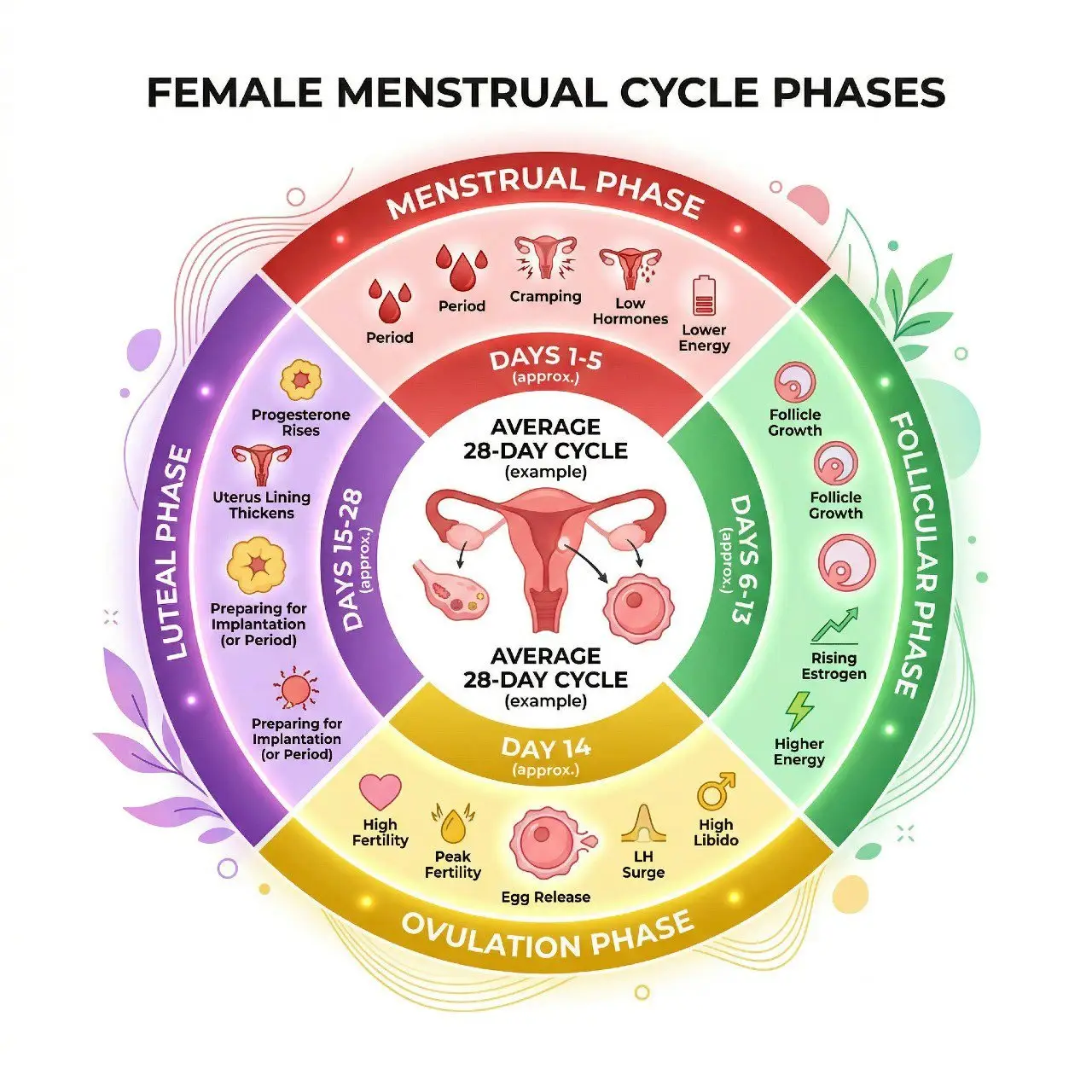 - Your menstrual cycle has four phases — menstrual, follicular, ovulation, and luteal — each driven by distinct hormonal shifts that affect metabolism, energy, and fat loss.
