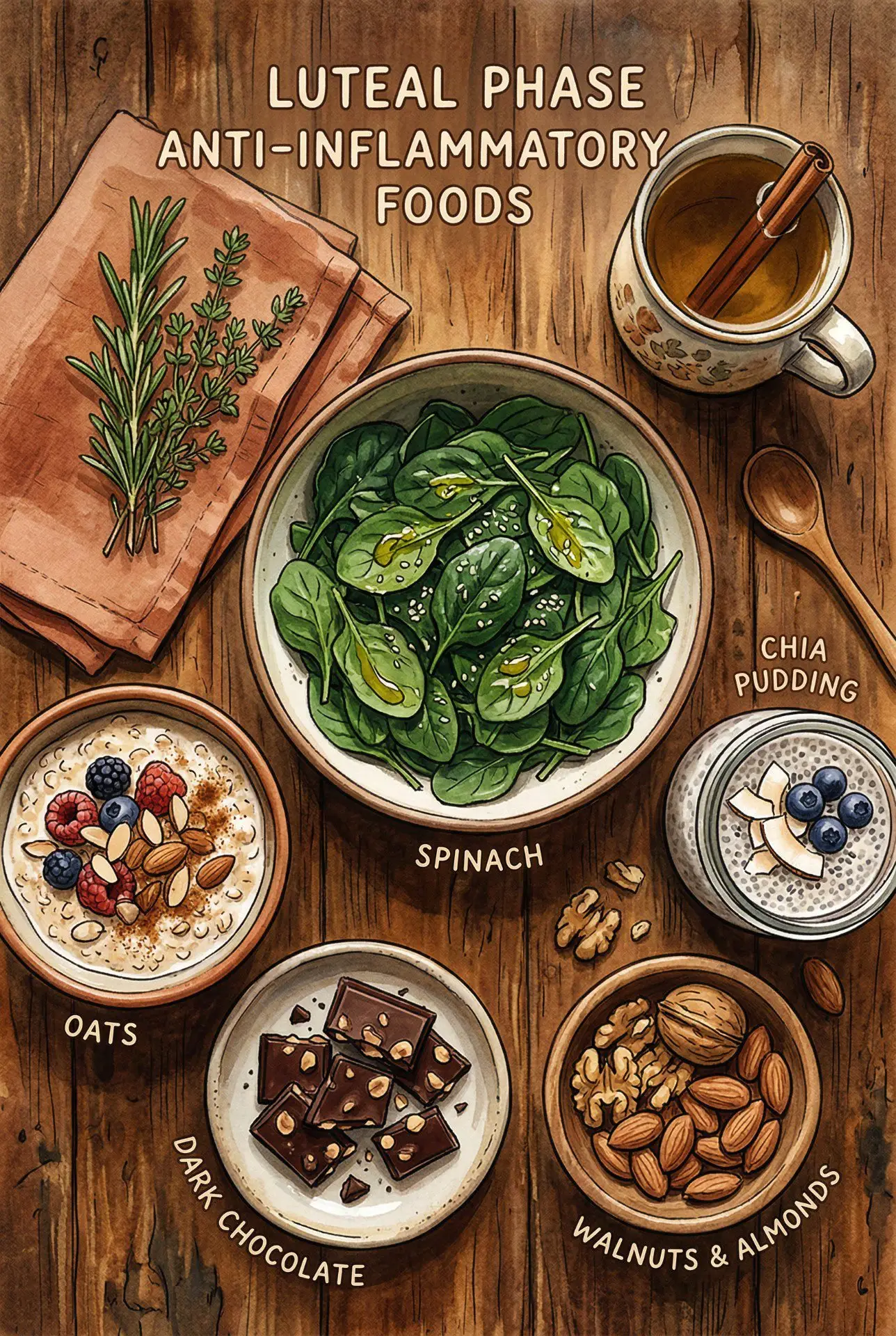 Focus on: Iron-rich foods (spinach, lentils, grass-fed red meat), omega-3 fatty acids to reduce inflammation (salmon, walnuts, flaxseed), magnesium-rich foods for cramps (dark chocolate, pumpkin seeds, avocado), and warming complex carbohydrates.